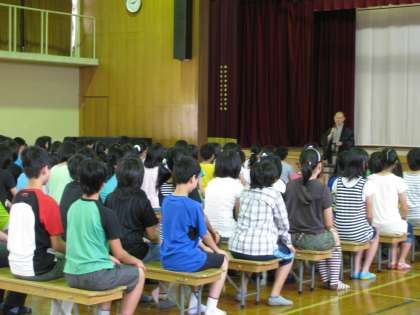 体験に先立って,まず6年生全員が体育館に集まり,お茶について,茶道について,わかりやすいお話を先生からうかがいました。