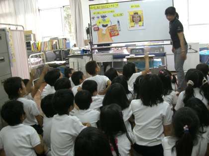先日の歯みがき巡回指導に続いて,歯のみがき方の確認とカラーテスターを使った実験を見せていただきました。