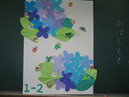 もうすぐ「6月の集い」があります。呉竹総合支援学校の人が来てくださったって,ゲームをしたり,歌を歌ったりして楽しく過ごします。その時掲示する「あじさいの花」を作りました。あじさいの花びらの中に,友だちとなかよくなれるためにどんなことをするのかを考えて書きました。みんなの思いのいっぱいつまった大きなあじさいの花。これからもずっとずっと咲き続けてほしいです。