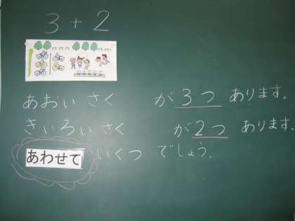 算数の授業では,今公園の挿絵を見ながら問題作りに取り組んでいます。自分で「3+2」になるように,文章を考えるのは,なかなか難しいようです。「あわせて」や「みんなで」や「ぜんぶで」を使ったお話(問題文)をがんばって作っている子ども達です。