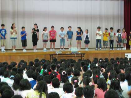 舞台の上で,一人一人,現学年・学級と自分の名前を自己紹介してもらいました。