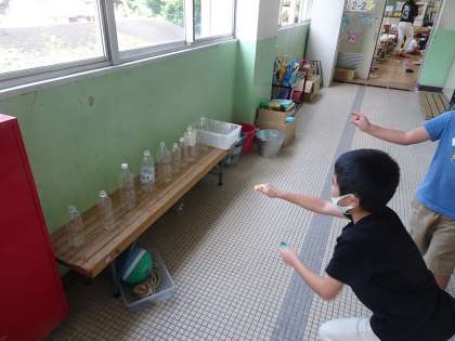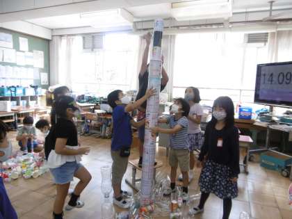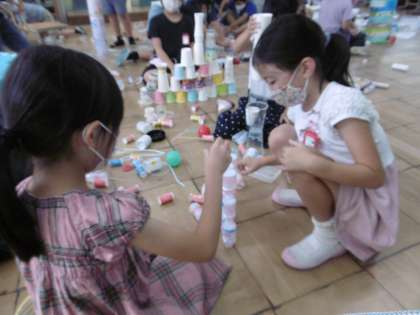 ペットボトルや紙コップ・箱など種類ごとにコーナーを作り,グループに分かれて,みんなで遊びを考えました。箱を高く積んで家を作ったり,立てたペットボトルにキャップやガチャ玉を当てて倒したり,紙コップを並べて,ドミノ倒しをしたりなど,色々な遊びをして楽しみました。