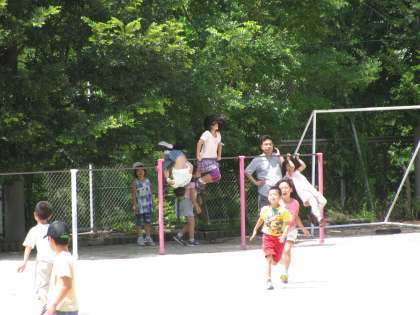 青空の下,運動場では,元気いっぱい子どもたちが遊んでいます。