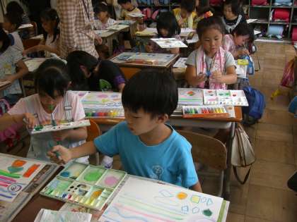 今日は前回よりたくさんの色を使ったり,色を混ぜたりして線や形の色塗りを練習しました。パレットや筆を持つ手にも「慣れ」が見られます。