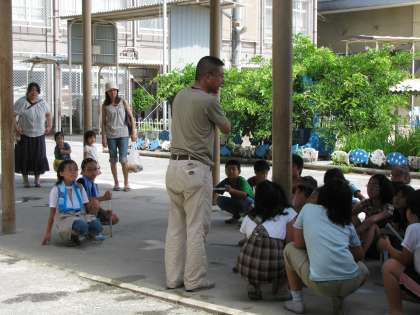 また,中庭では4年生が,空気でっぽうを使った実験をしていました。遠くまで飛ばすためにはどうすればいいか考えていました。
