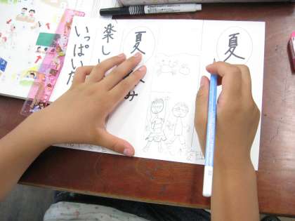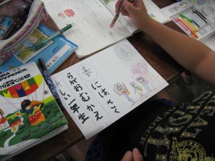2年生で習った漢字の読みを復習した後、絵を見て想像を広げ、「時を表す言葉」を使いながらかるた作りに取り組みました。