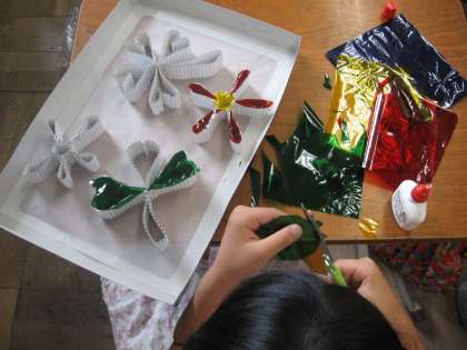 ダンボール紙を、切ったり折ったりしながら好きなかたちを作っていき、ボンドで貼り付けていきます。