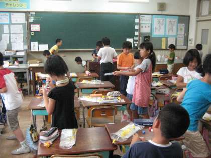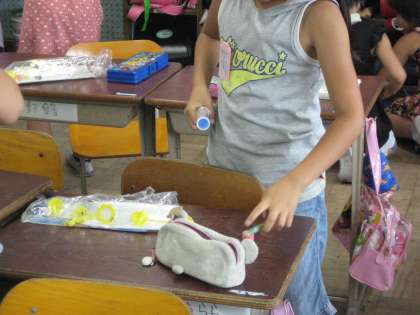 「空気でっぽう」では,おしぼうの長さを変えて飛ばしてみたり,押すいきおいを変えて飛ばしてみたりとたくさんの工夫をしていました。