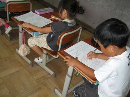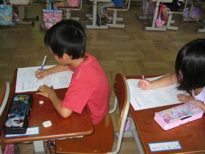 夏休み前のたしかめのテストをしています。算数の文章題のテストに取り組んでいる写真です。文章の中から.キーワードを探したしざんかひきざんかを考えます。よく読んで考えないと,どちらの式になるかわかりません。
