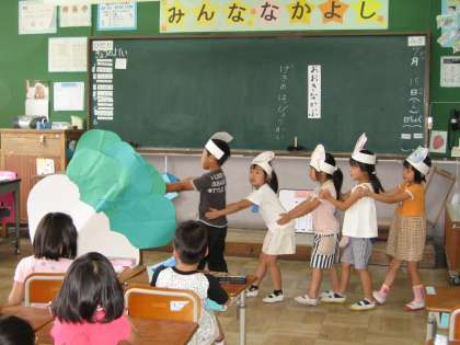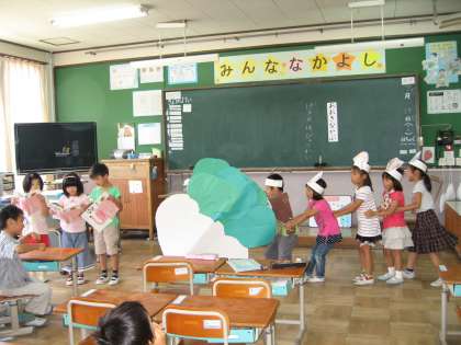 今日は,「おおきなかぶ」のグループ発表でした。それぞれが工夫してすてきな劇になりました。ぬけた後.どうなったかも考えました。楽しい続き話が出来上がり,おおいに盛り上がった発表会でした。