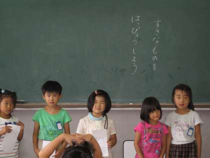 国語の学習で、自分の好きなものをみんなの前で発表しました。子ども達は,日直などでみんなの前で発表する場があるので慣れています,どの人も堂々と発表しました。こちらは,一人で発表をしました。入学して4ヶ月足らず・・・成長しました!