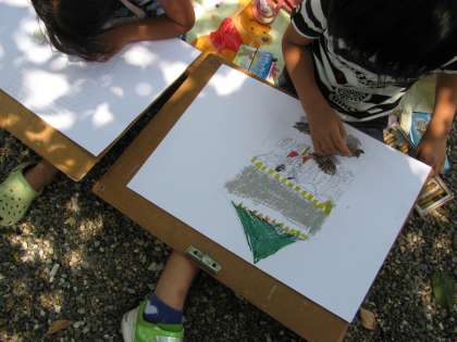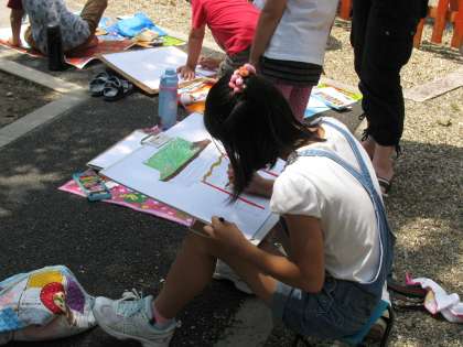 暑さに負けず,子どもたちは熱心に被写体を見つめ,画用紙に表現しています。