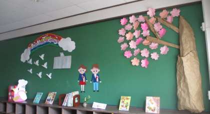 桃山小学校にランチルームができました!大きなテーブルにお花を飾り,食育の本や食べ物紹介カードなど,給食を楽しく食べながら,食について学べる部屋です。