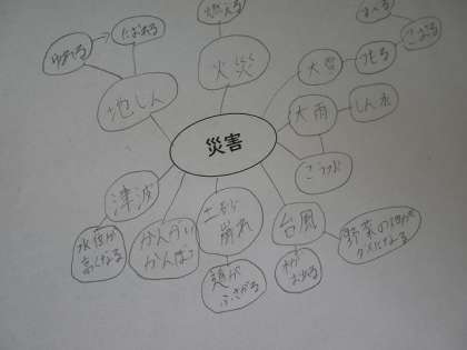 初回では,「災害」という言葉から思いつくことをマップ形式でたくさん挙げました。