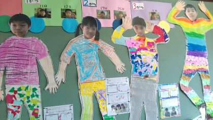 服やズボンをクレパスでしっかりと塗ったり,折り紙をちぎって貼ったりすることができました。