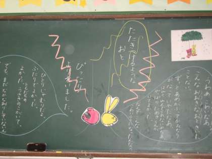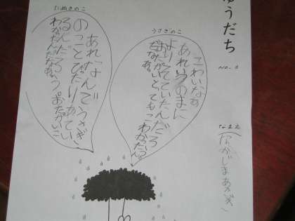 今,「ゆうだち」の学習をしています。うさぎのことたぬきのこがあまやどりしているとき,おそろしいかみなりがなりひびきます。このお話の山場です。子ども達は,この二人の気持ちを考えたり動作化したりしました。
