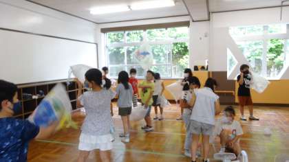 屋内でも,送風機を使ってビニール袋の作品をとばしました。