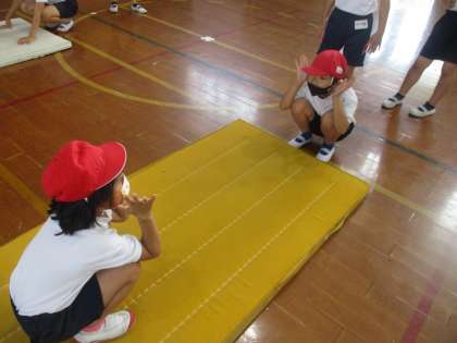 アドバイスを出し合いながら,マット運動の技に磨きをかけています。