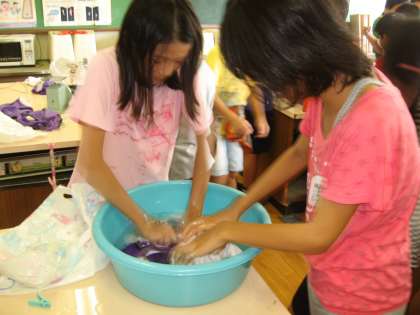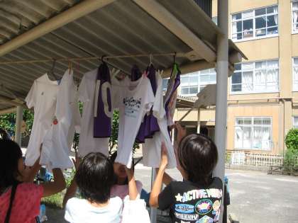 洗濯したいものを一生懸命洗いました。そして,脱水し,わたりろうかに干しました。しわをのばして,かわかしました。