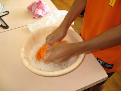 家庭科の学習で,洗濯をしました。今日は,1組と2組。来週3組が取り組みます。