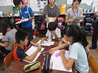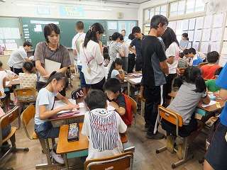 話し合い活動を重視した授業展開や担任とTT教員の二人体制で進めた指導法の有効性等について,みんなで授業を観た後,研究会で話し合いました。