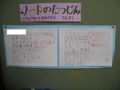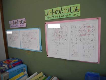 教室の後ろの掲示板に,ノートの達人コーナーを
