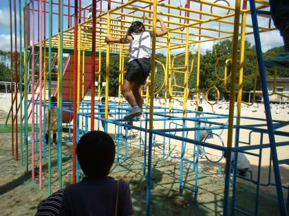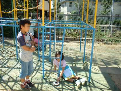 算数で長さ調べをしました。まきじゃくを使い,定規でははかれないような長さをはかります。すべりだいの長さやジャングルジムの高さを調べている子どもがいました。予想した長さと違いおどろきがあったようです。