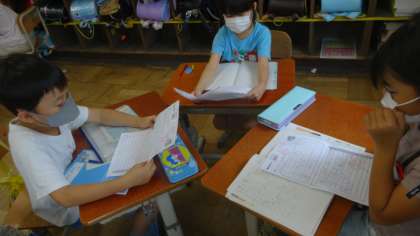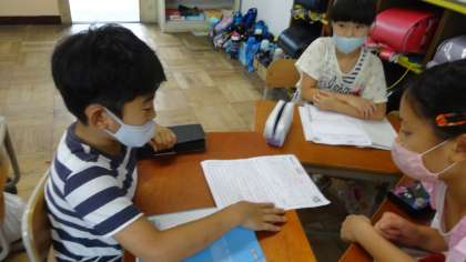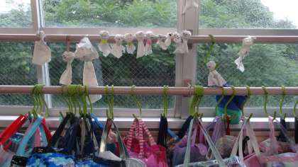 今日は,雨で水泳学習が中止になりましたが,教室にたくさんのてるてる坊主を飾って,楽しく学習に励んでいました。