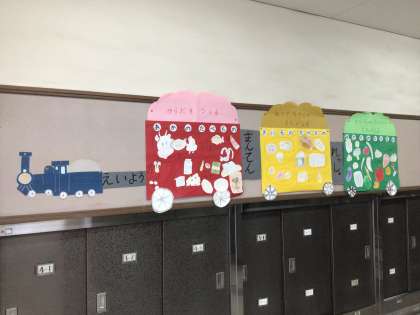 給食委員会で,給食室の中に,「えいようまんてんれっしゃ」という掲示物を作りました。委員会の時間に皆で取り組み,できなかったところは5年生が休み時間を使ってがんばって仕上げてくれました。