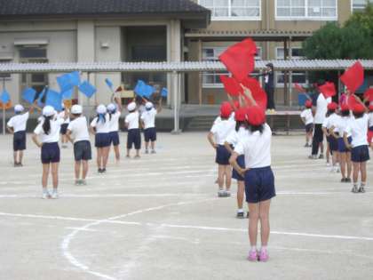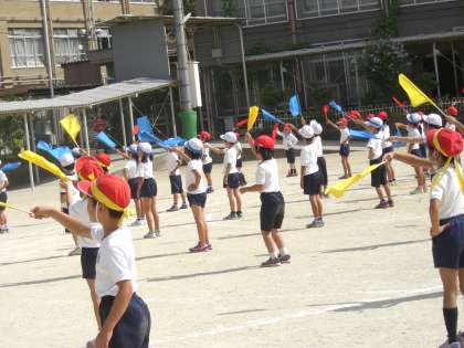 今までは,ショートフラッグを持つふりをしての練習でしたが,今日初めて本当に旗を手にして表現してみました。赤・青・黄それぞれの色の動きが揃うととてもきれいです。