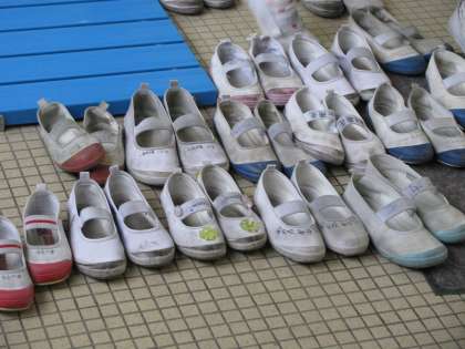 図書室を利用していた2年生。図書室前に脱がれた上靴がとてもきれいに並んでいました。