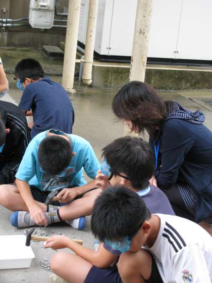 6年生は,渡り廊下で化石を見つけています。きちんと専用ゴーグルをはめています。