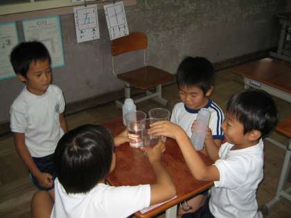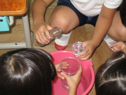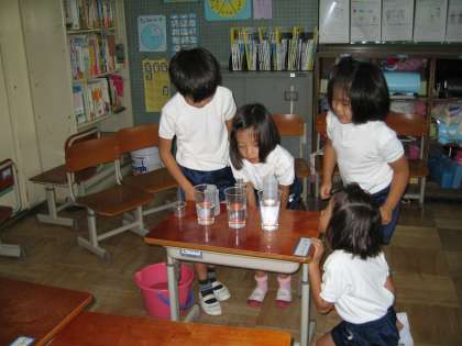 算数の授業では,かさくらべをしました。3種類の容器に入るかさの量を比べる学習をしました。実際に,グループに3種類の容器を配り,水を入れて比べました。こぼさないように,気をつけながら実験していた子ども達です。予想と違うところもあり,おおいに盛り上がりました。