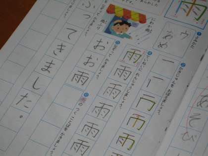 漢字を習いだした1年生です、漢字を使えるのが,嬉しくって嬉しくって,やる気満々です。でも、今日学習した「雨」という文字は,うまく形がとれなくて,何度も消しゴムを使っては書き直していました。7画目からの点々がバランス良く書けなくて困っていた子ども達です。でも「雨」の熟語は、どんどん発表してくれていました。