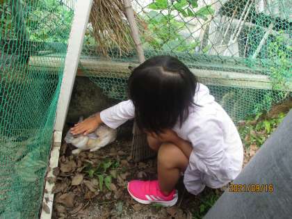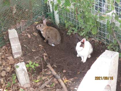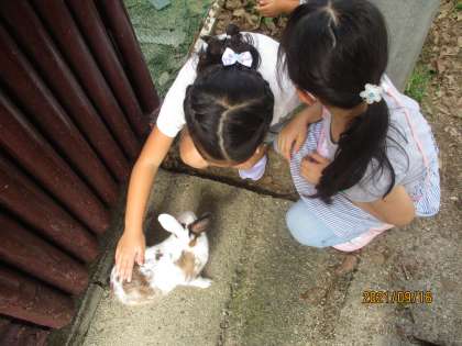 学校でかっているウサギのプリッツちゃんとココアちゃんと