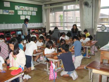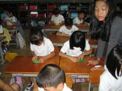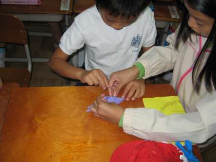 6年生が修学旅行に広島へいきます。その時平和集会をするのに,全校が折った鶴を持っていきます。今日は,6年生に教えてもらって折鶴に挑戦しました。みんなの平和への願いを折っていってもらいましょう。