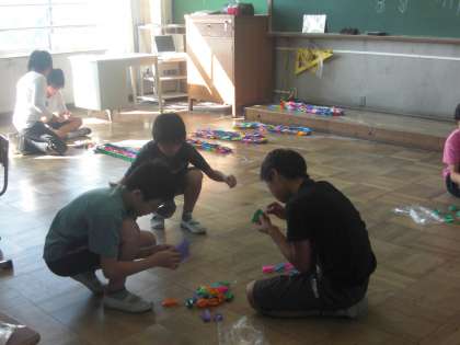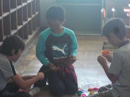 千羽をひとつにまとめて,広島にもっていけるように,折鶴実行委員の子どもたちを中心にがんばっています。