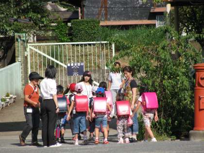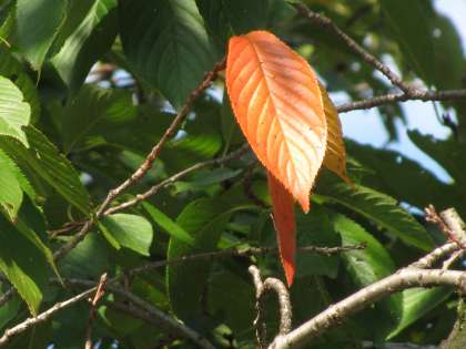 まだ緑色が多い中で,一番先に色づき始め,きらきら光っている桜の一葉も,「今日も頑張ったね。」と風に揺れています。