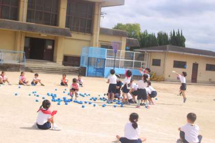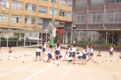 赤(1組)と青(2組)に分かれて 勝負する玉入れ合戦!