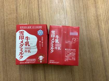 そのあとの給食では,みんなもりもり食べながら「あ!メグミルクさんや。おいしい!」