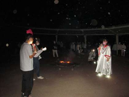 燃え上がる炎を囲んで,みんなで楽しくキャンプファイヤーをしました。