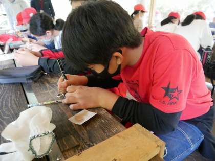 ウッドキーホルダー作りを体験しました。