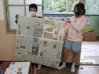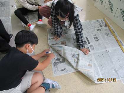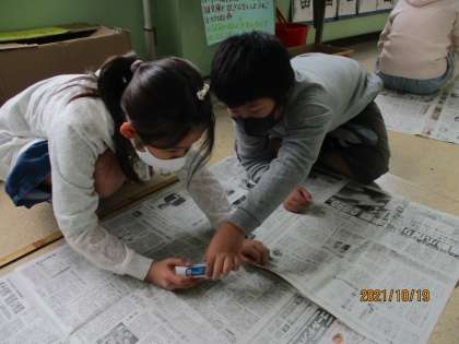 算数科の学習で,新聞紙を使って1平方メートルを作りました。新聞紙を貼り合わせるときは,紙が大きくて大変でしたが,ペアの友達と協力して1平方メートルが完成した時には,「やった〜!」と歓声をあげて喜んでいました。