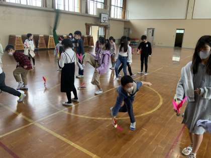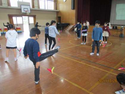 話を聞いたあとは,体験学習をしました。「ジェンズ」という羽のついたものを足でける遊びに挑戦しました。初めはジェンズをうまく蹴れませんでしたが,練習するうちにどんどんうまくなって,友達と2人組でジェンズをパスし合えるようになった人もいました。「もっとやりたい!」「楽しかった!」と大満足の子ども達でした。