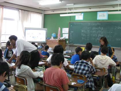 教室では,子どもたち,担任,そしてアンガス先生,みんなで楽しく学習を進めていました。