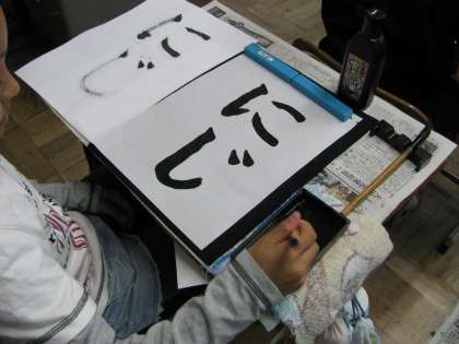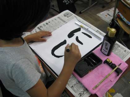 習字で「にじ」という字をかきました。習字をはじめて半年。こんなに上手にかけるようになりました。手元の用具をきちんと整理し,心静かに半紙に向かいましょうと指導を進めてきました。