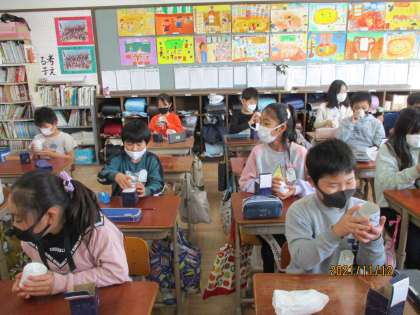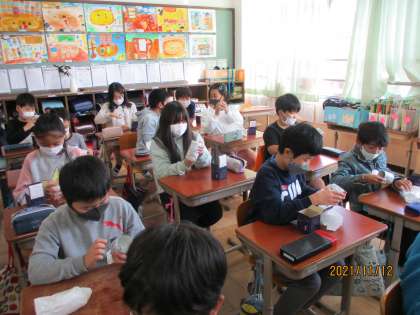 総合的な学習の時間に「清水焼の絵付け体験」に取り組んだ4年生の子ども達。ついに,湯呑が焼き上がり,無事に手元に届けられました。自分がデザインした絵柄が湯呑となって届いた感動は大きく,大喜びしていました。また,湯呑の入った箱を大事そうに抱える姿も微笑ましかったです。