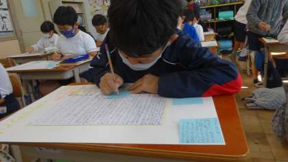 国語で取り組んでいた,説明文の学習の単元も最終時間となり,出来上がった「食べ物のひみつ」の文章を読み合う時間をとりました。