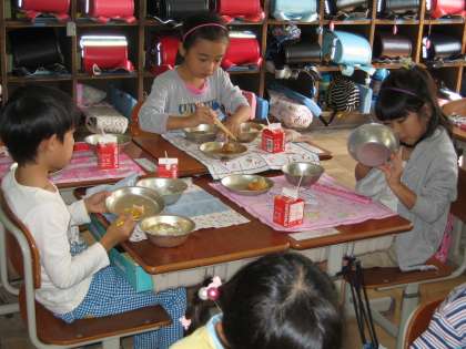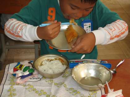今日の給食の献立は,カレーあんかけごはんと春巻きでした。体育があって運動をして,おなかが空いていることもあり,ぺろりとたいらげました。1年生もだんだん食べる量がふえて,おかわりしても足りない人も出てきています。今日もすっからかんです!
