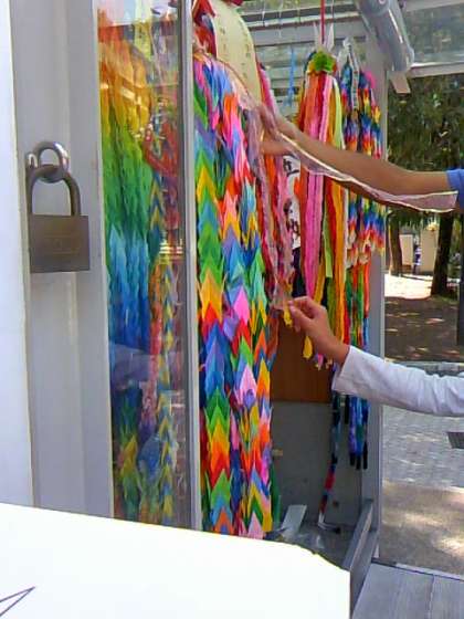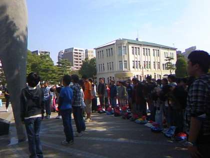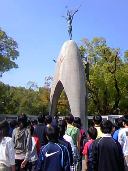 平和記念公園の中にある「原爆の子」の像の前で,平和集会を行いました。平和宣言をし,「折鶴」を歌い,桃山小学校のみんなで作った千羽鶴を捧げました。